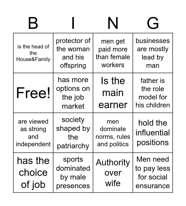 This bingo card has 16 words: sports dominated by male presences, hold the influential positions, men get paid more than female workers, is the head of the House&Family, are viewed as strong and independent, protector of the woman and his offspring, men dominate norms, rules and politics, Authority over wife, Free!, has more options on the job market, has the choice of job, businesses are mostly lead by man, society shaped by the patriarchy, father is the role model for his children, Is the main earner and Men need to pay less for social ensurance.