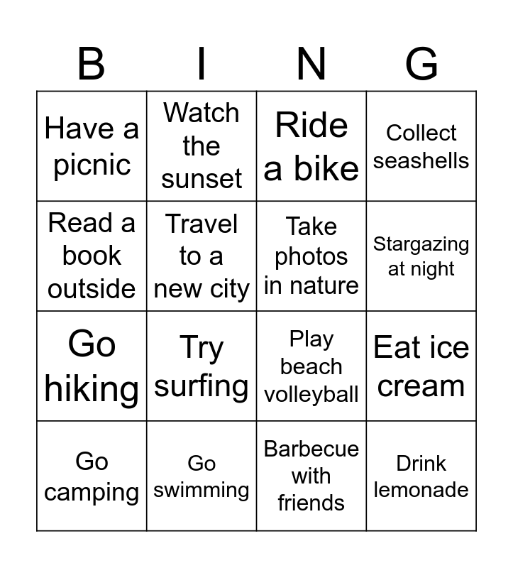 This bingo card has 16 words: Go swimming, Eat ice cream, Ride a bike, Have a picnic, Go hiking, Watch the sunset, Play beach volleyball, Barbecue with friends, Read a book outside, Travel to a new city, Go camping, Collect seashells, Try surfing, Stargazing at night, Take photos in nature and Drink lemonade.