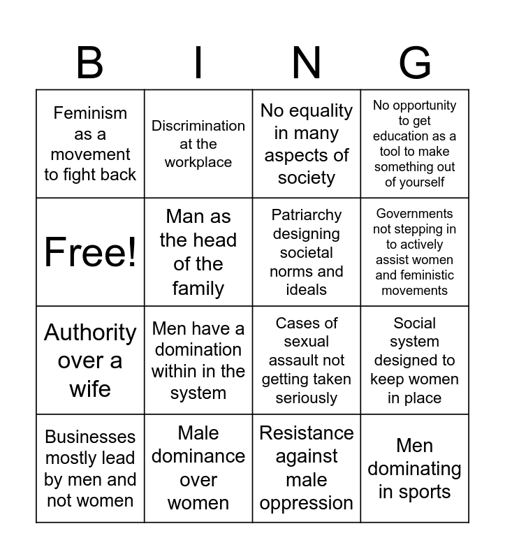 This bingo card has 16 words: Male dominance over women, Social system designed to keep women in place, No equality in many aspects of society, Feminism as a movement to fight back, Authority over a wife, Discrimination at the workplace, Cases of sexual assault not getting taken seriously, Resistance against male oppression, Free!, Man as the head of the family, Businesses mostly lead by men and not women, No opportunity to get education as a tool to make something out of yourself, Men have a domination within in the system, Governments not stepping in to actively assist women and feministic movements, Patriarchy designing societal norms and ideals and Men dominating in sports.