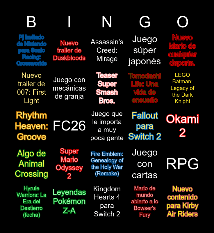 This bingo card has a free space and 24 words: Super Mario Odyssey 2, Leyendas Pokémon Z-A, Teaser Super Smash Bros., Hyrule Warriors: La Era del Destierro (fecha), Nuevo Mario de cualquier deporte., Pj invitado de Nintendo para Sonic Racing: Crossworlds, Nuevo trailer de 007: First Light, Nuevo trailer de Duskbloods, Fallout para Switch 2, Fire Emblem: Genealogy of the Holy War (Remake), Tomodachi Life: Una vida de ensueño, Rhythm Heaven: Groove, Juego con cartas, RPG, Juego con mecánicas de granja, Mario de mundo abierto a lo Bowser's Fury, Okami 2, Assassin's Creed: Mirage, LEGO Batman: Legacy of the Dark Knight, FC26, Nuevo contenido para Kirby Air Riders, Algo de Animal Crossing, Juego súper japonés and Kingdom Hearts 4 para Switch 2.