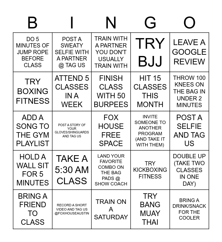 This bingo card has a free space and 24 words: TAKE A 5:30 AM CLASS, RECORD A SHORT VIDEO AND TAG US @FOXHOUSEAUSTIN, FINISH CLASS WITH 50 BURPEES, BRING A FRIEND TO CLASS, LEAVE A GOOGLE REVIEW, DO 5 MINUTES OF JUMP ROPE BEFORE CLASS, TRY BOXING FITNESS, POST A SWEATY SELFIE WITH A PARTNER @ TAG US, INVITE SOMEONE TO ANOTHER PROGRAM (AND TAKE IT WITH THEM), LAND YOUR FAVORITE COMBO ON THE BAG PADS @ SHOW COACH, HIT 15 CLASSES THIS MONTH, ADD A SONG TO THE GYM PLAYLIST, TRY KICKBOXING FITNESS, DOUBLE UP (TAKE TWO CLASSES IN ONE DAY), ATTEND 5 CLASSES IN A WEEK, TRY BANG MUAY THAI, POST A SELFIE AND TAG US, TRAIN WITH A PARTNER YOU DON'T USUALLY TRAIN WITH, THROW 100 KNEES ON THE BAG IN UNDER 2 MINUTES, POST A STORY OF YOUR GLOVES/SHINGUARDS AND TAG US, BRING A DRINK/SNACK FOR THE COOLER, HOLD A WALL SIT FOR 5 MINUTES, TRY BJJ and TRAIN ON A SATURDAY.