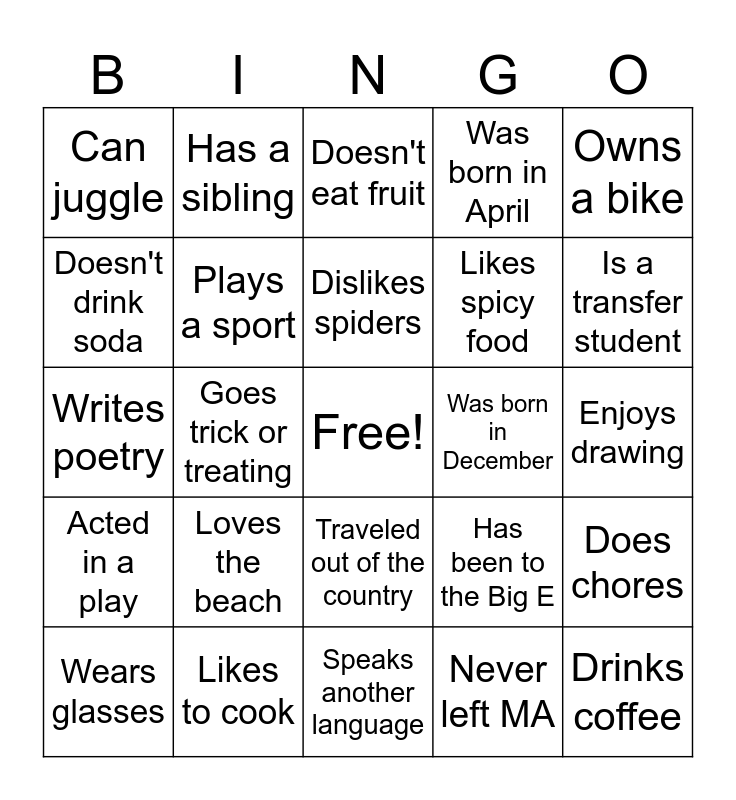 This bingo card has a free space and 34 words: Has a pet, Never left MA, Loves tacos, Favorite color is green, Acted in a play, Plays a sport, Owns a bike, Wears glasses, Has a sibling, Favorite season is spring, Dislikes spiders, Doesn't eat fruit, Has dyed their hair, Skis / Snowboards, Was born in December, Is a transfer student, Likes to cook, Writes poetry, Loves the beach, Has been to the Big E, Traveled out of the country, Likes a non-MA sports team, Can juggle, Enjoys drawing, Speaks another language, Drinks coffee, Was born in April, Has been to a concert, Likes spicy food, Doesn't drink soda, Bakes cookies, Goes trick or treating, Does chores and Doesn't drink energy drinks.