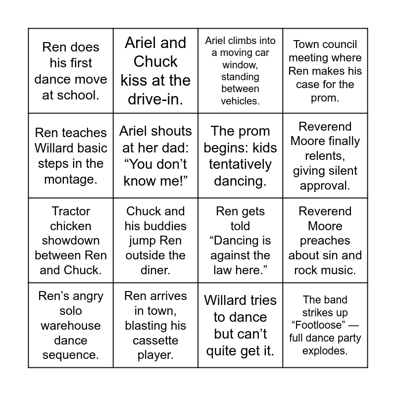 This bingo card has 16 words: Ren arrives in town, blasting his cassette player., Reverend Moore preaches about sin and rock music., Ariel climbs into a moving car window, standing between vehicles., Ren does his first dance move at school., Tractor chicken showdown between Ren and Chuck., Ariel and Chuck kiss at the drive-in., Ren gets told “Dancing is against the law here.”, Willard tries to dance but can’t quite get it., Ren teaches Willard basic steps in the montage., Ariel shouts at her dad: “You don’t know me!”, Ren’s angry solo warehouse dance sequence., Town council meeting where Ren makes his case for the prom., Chuck and his buddies jump Ren outside the diner., Reverend Moore finally relents, giving silent approval., The prom begins: kids tentatively dancing. and The band strikes up “Footloose” — full dance party explodes..
