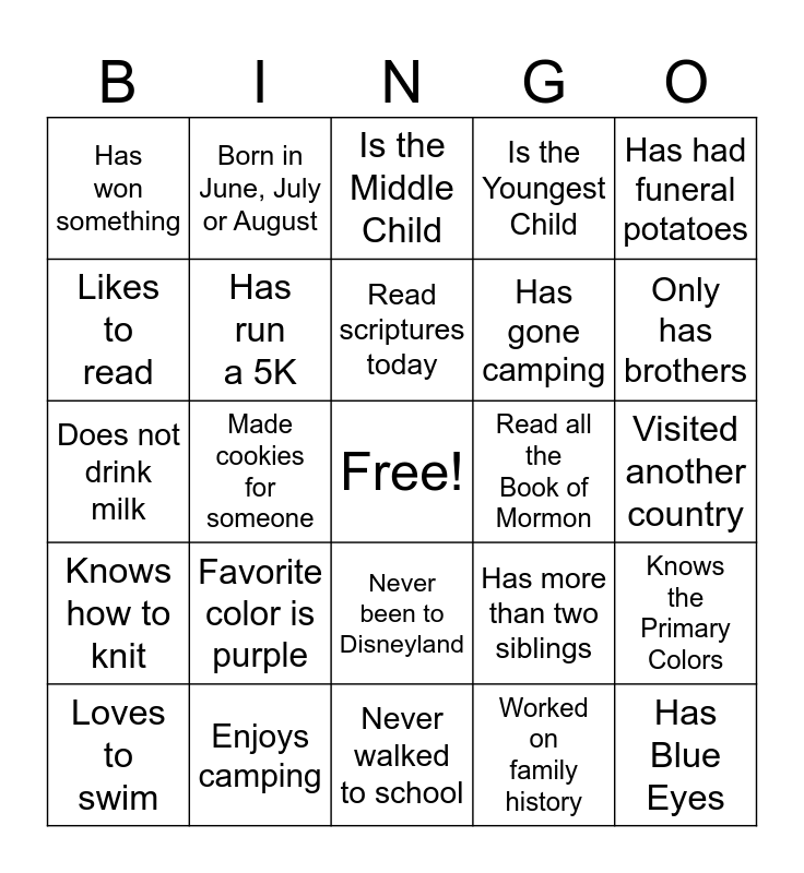 This bingo card has a free space and 74 words: Is wearing blue, Has taken dance lessons, Read scriptures today, Likes tomatoes, Has a pet, Plays a musical instrument, Speaks two languages, Loves to garden, Has broken a bone, Has been in a play, Loves to swim, Owns a pair of flip flops, Has gone camping, Has had funeral potatoes, Likes to cook, Enjoys camping, Has been to the ocean, Read all the Book of Mormon, Writes in a journal, Has won something, Made cookies for someone, Is the Middle Child, Is the Youngest Child, Visited another country, Likes to read, Has taken piano lessons, Sings in a choir, Has family in Utah, Has gone ice skating, Knows the Articles of Faith, Has run a 5K, Never Touched Snow, Has a dog, Has baked bread, Is the youngest in family, Has had stitches, Has brown eyes, Has naturally curly hair, Has Blue Eyes, Exercises regularly, Plays or played on a sports team, Never been to Disneyland, Likes sushi, Is wearing earrings, Wears glasses, Born in June, July or August, Favorite season is summer, Gave a compliment today, Likes to go fishing, Favorite pizza is pepperoni, Born in another state, Is a lefty, Has more than two siblings, Did not have soda pop today, Likes chocolate, Eats vegetables daily, Never walked to school, Taught a lesson, Is afraid of spiders, Knows how to knit, Favorite color is purple, Made your bed today, Worked on family history, Knows the Primary Colors, Does not drink milk, Has/Had braces, Was born in December, Chooses salty over sweet, Only has brothers, Can Draw, Can whistle, Is extremely ticklish, Has allergies and Plays Basketball.