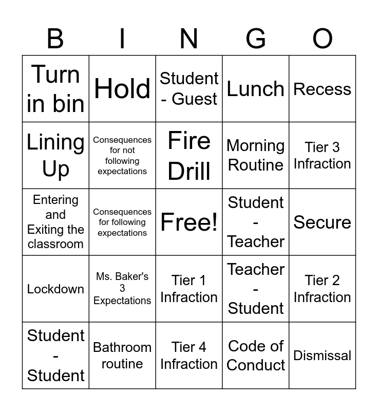 This bingo card has a free space and 24 words: Ms. Baker's 3 Expectations, Bathroom routine, Fire Drill, Student - Student, Recess, Turn in bin, Lining Up, Hold, Student - Teacher, Tier 1 Infraction, Morning Routine, Entering and Exiting the classroom, Teacher - Student, Tier 2 Infraction, Consequences for not following expectations, Code of Conduct, Secure, Student - Guest, Tier 3 Infraction, Consequences for following expectations, Dismissal, Lockdown, Lunch and Tier 4 Infraction.