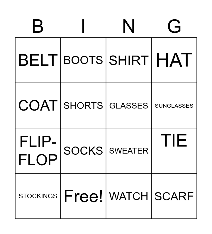 This bingo card has 28 words: PANTS, T-SHIRT, FLIP-FLOP, PIJAMAS, SHORTS, SHIRT, BOOTS, SCARF, Free!, SKIRT, SWEATER, HAT, DRESS, SHOES, SOCKS, SNEAKERS, CAP, GLASSES, SUNGLASSES, SWIMSUIT, BELT, GLOVES, STOCKINGS, TIE, WATCH, BLOUSE, COAT and SUIT.