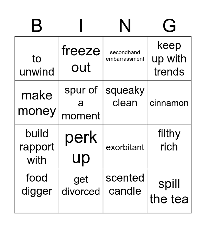 This bingo card has 17 words: scented candle, food digger, secondhand embarrassment, to unwind, perk up, keep up with trends, filthy rich, squeaky clean, cinnamon, spur of a moment, get divorced, exorbitant, make money, freeze out, build rapport with, improve something and spill the tea.