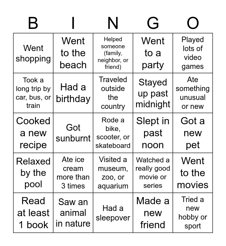 This bingo card has 25 words: Ate ice cream more than 3 times, Had a sleepover, Traveled outside the country, Read at least 1 book, Played lots of video games, Went shopping, Took a long trip by car, bus, or train, Went to the beach, Slept in past noon, Visited a museum, zoo, or aquarium, Stayed up past midnight, Cooked a new recipe, Watched a really good movie or series, Went to the movies, Had a birthday, Tried a new hobby or sport, Got a new pet, Helped someone (family, neighbor, or friend), Ate something unusual or new, Got sunburnt, Rode a bike, scooter, or skateboard, Saw an animal in nature, Relaxed by the pool, Went to a party and Made a new friend.