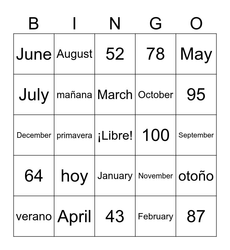 This bingo card has a free space and 26 words: January, February, March, April, May, June, July, August, September, November, October, December, otoño, verano, primavera, invierno, 78, 64, 52, 87, 95, 43, 100, hoy, mañana and ayer.