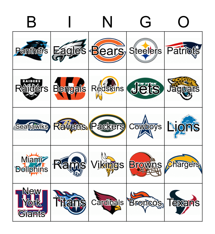 This bingo card has 31 images and 31 words: Cardinals, Falcons, Ravens, Bills, Panthers, Bears, Bengals, Browns, Cowboys, Broncos, Lions, Packers, Texans, Colts, Jaguars, Chiefs, Chargers, Rams, Miami Dollphins, Vikings, Patriots, Saints, New York Giants, Eagles, Jets, Raiders, Steelers, Seahawlks, Titans, Redskins and Buccaneers.