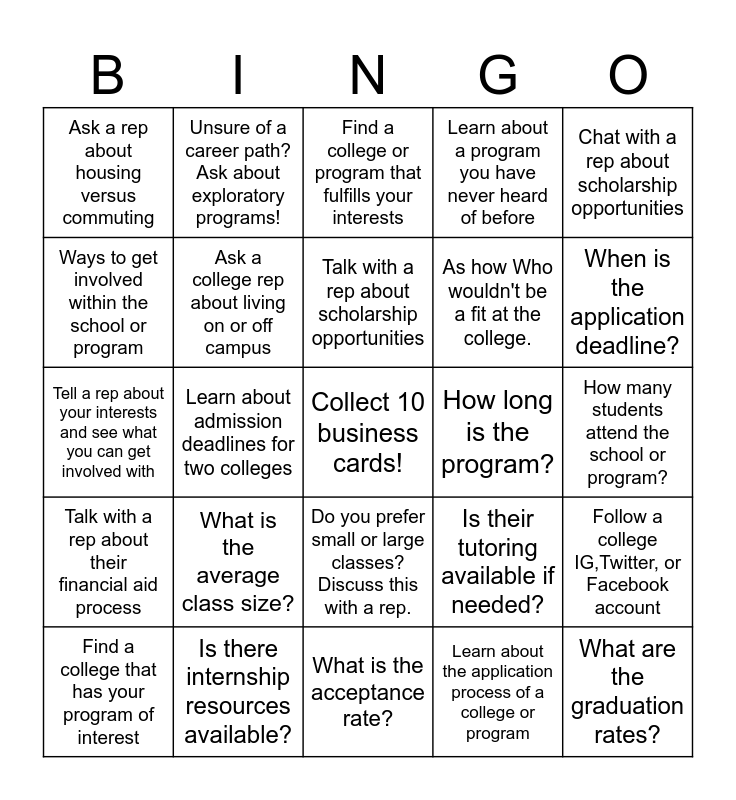 This bingo card has a free space and 29 words: Find a college that has your program of interest, Learn about 3 clubs or activities available within this institution, Learn about admission deadlines for two colleges, Ask a college rep what that college is most known for, Ask a rep about housing versus commuting, Find a college or program that fulfills your interests, Ask a college rep about living on or off campus, What is the average class size?, How long is the program?, Is there internship resources available?, How many students attend the school or program?, What are the graduation rates?, What is the acceptance rate?, Learn about the application process of a college or program, When is the application deadline?, Ask a rep about their average class sizes, Do you prefer small or large classes? Discuss this with a rep., Talk with a rep about their financial aid process, Chat with a rep about scholarship opportunities, Tell a rep about your interests and see what you can get involved with, Is their tutoring available if needed?, Ask how to schedule a college tour!, As how Who wouldn't be a fit at the college., Ways to get involved within the school or program, Learn about a program you have never heard of before, Unsure of a career path? Ask about exploratory programs!, Follow a college IG,Twitter, or Facebook account, Talk with a rep about scholarship opportunities and Learn about a college you have never heard of!.