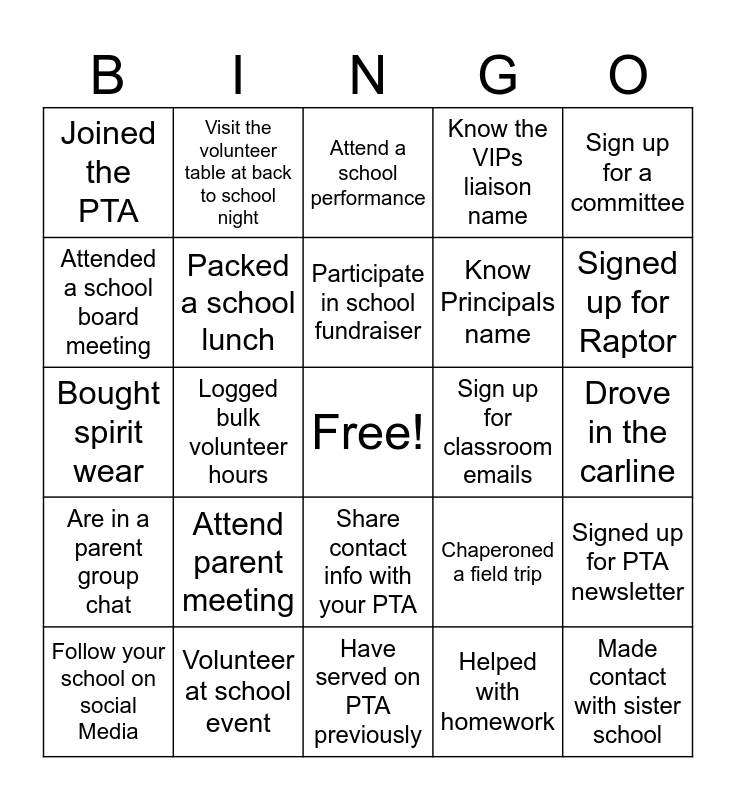 This bingo card has a free space and 24 words: Attend parent meeting, Volunteer at school event, Participate in school fundraiser, Follow your school on social Media, Sign up for a committee, Joined the PTA, Attended a school board meeting, Visit the volunteer table at back to school night, Sign up for classroom emails, Share contact info with your PTA, Know Principals name, Bought spirit wear, Chaperoned a field trip, Signed up for PTA newsletter, Packed a school lunch, Helped with homework, Drove in the carline, Attend a school performance, Signed up for Raptor, Logged bulk volunteer hours, Made contact with sister school, Are in a parent group chat, Know the VIPs liaison name and Have served on PTA previously.