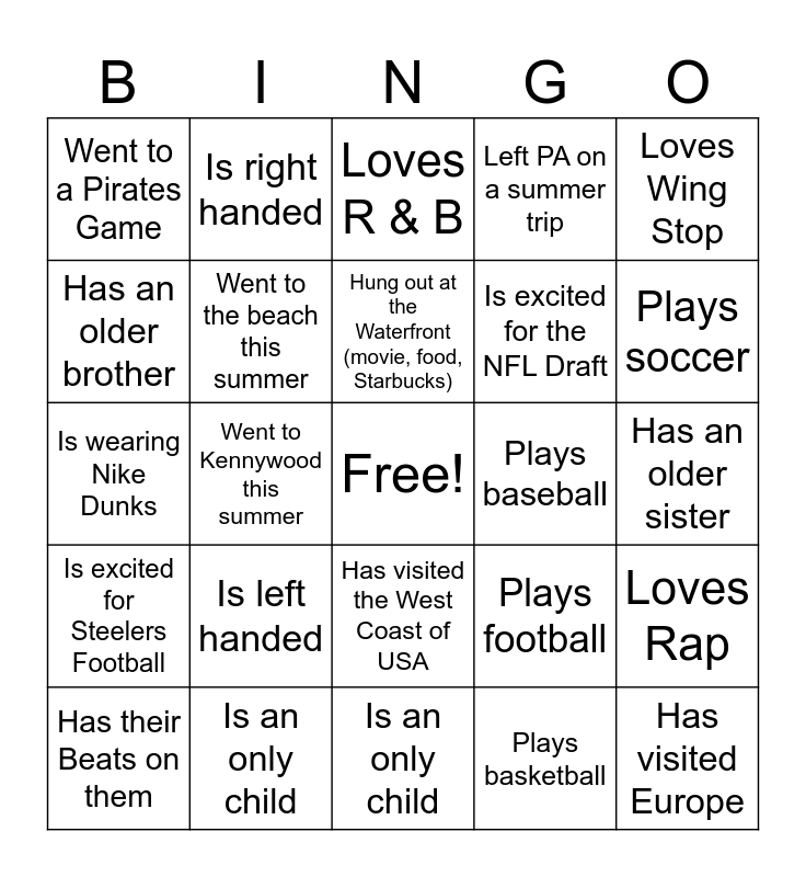 This bingo card has a free space and 24 words: Is left handed, Is an only child, Hung out at the Waterfront (movie, food, Starbucks), Has their Beats on them, Loves Wing Stop, Went to a Pirates Game, Has an older brother, Is right handed, Plays baseball, Has visited the West Coast of USA, Is excited for the NFL Draft, Is wearing Nike Dunks, Plays football, Loves Rap, Went to the beach this summer, Plays basketball, Has an older sister, Loves R & B, Plays soccer, Went to Kennywood this summer, Has visited Europe, Is excited for Steelers Football, Left PA on a summer trip and Is an only child.