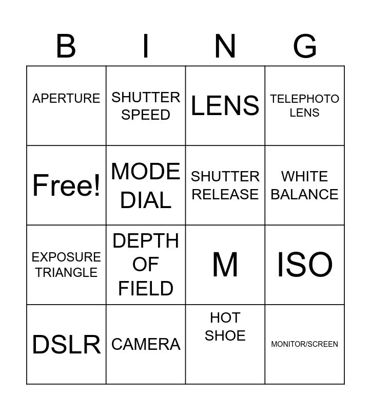This bingo card has 16 words: CAMERA, ISO, LENS, APERTURE, EXPOSURE TRIANGLE, SHUTTER SPEED, M, HOT SHOE, Free!, MODE DIAL, DSLR, TELEPHOTO LENS, DEPTH OF FIELD, WHITE BALANCE, SHUTTER RELEASE and MONITOR/SCREEN.