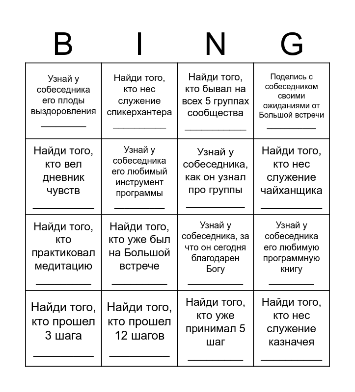This bingo card has 16 words: Найди того, кто прошел 12 шагов _________, Узнай у собеседника его любимую программную книгу _________, Найди того, кто бывал на всех 5 группах сообщества ___________, Узнай у собеседника его плоды выздоровления _________, Найди того, кто практиковал медитацию _________, Найди того, кто нес служение спикерхантера __________, Узнай у собеседника, за что он сегодня благодарен Богу ___________, Найди того, кто уже принимал 5 шаг _________, Найди того, кто вел дневник чувств __________, Узнай у собеседника его любимый инструмент программы __________, Найди того, кто прошел 3 шага _________, Поделись с собеседником своими ожиданиями от Большой встречи ___________, Найди того, кто уже был на Большой встрече _________, Найди того, кто нес служение чайханщика __________, Узнай у собеседника, как он узнал про группы __________ and Найди того, кто нес служение казначея __________.