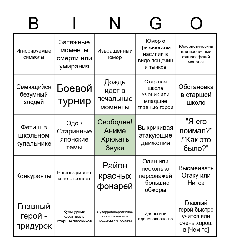 This bingo card has a free space and 24 words: Разговаривает и не стреляет, Культурный фестиваль старшеклассников, Дождь идет в печальные моменты, Главный герой - придурок, Юмористический или ироничный философский монолог, Игнорируемые символы, Смеющийся безумный злодей, Затяжные моменты смерти или умирания, Выкрикивая атакующие движения, Район красных фонарей, Старшая школа Ученик или младшие главные герои, Фетиш в школьном купальнике, Один или несколько персонажей - большие обжоры, Высмеивать Отаку или Нитса, Боевой турнир, Идолы или идолопоклонство, "Я его поймал?" /"Как это было?", Извращенный юмор, Обстановка в старшей школе, Эдо / Старинные японские темы, Главный герой быстро учится или очень хорош в [Чем-то], Конкуренты, Юмор о физическом насилии в виде пощечин и тычков and Суперрегенеративное заживление для продвижения сюжета.