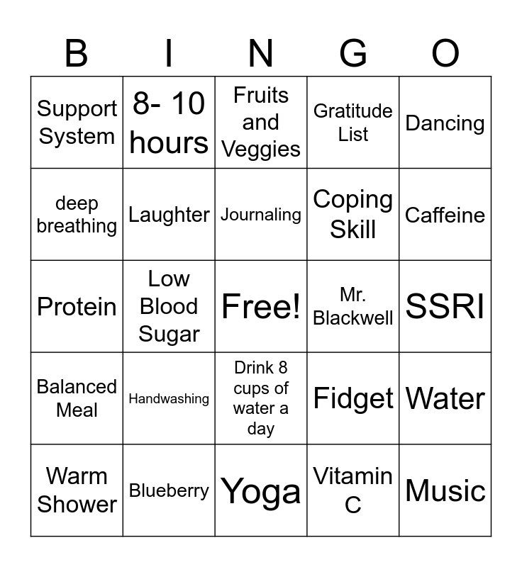 This bingo card has a free space and 26 words: Drink 8 cups of water a day, Vitamin C, Journaling, Blueberry, Dancing, Support System, deep breathing, 8- 10 hours, SSRI, Fidget, Coping Skill, Protein, Water, Warm Shower, Low Blood Sugar, Medication Reminder, Gratitude List, Balanced Meal, Fruits and Veggies, Music, Caffeine, Yoga, Mr. Blackwell, Handwashing, Laughter and Stretching.