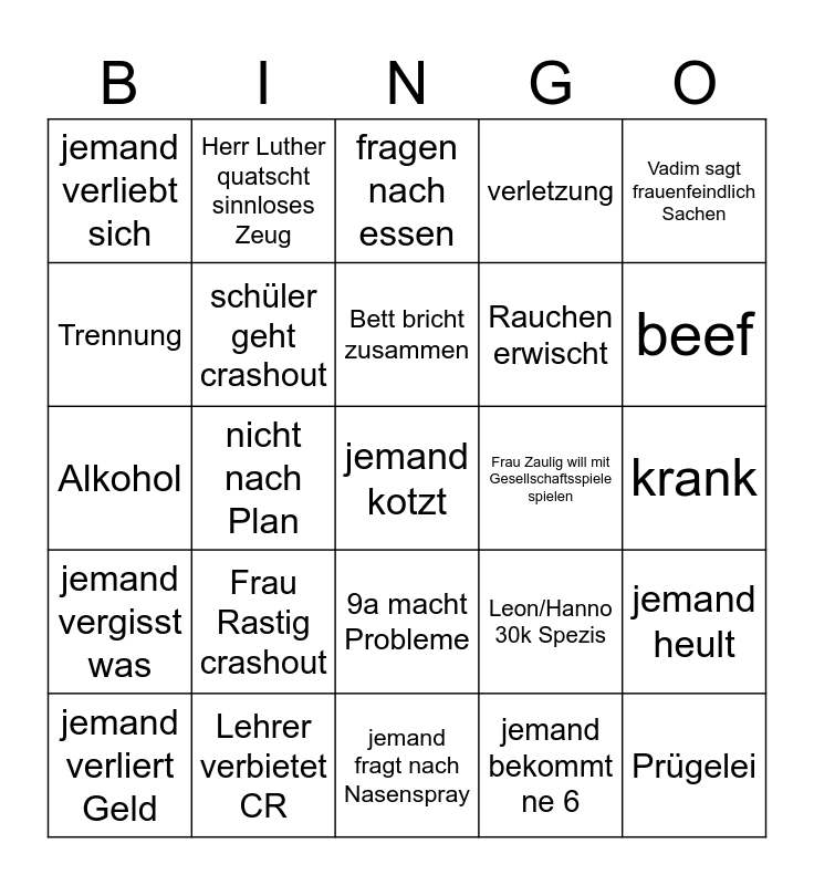 This bingo card has a free space and 24 words: Frau Rastig crashout, Lehrer verbietet CR, Bett bricht zusammen, jemand verliert Geld, Vadim sagt frauenfeindlich Sachen, jemand verliebt sich, Trennung, Herr Luther quatscht sinnloses Zeug, Frau Zaulig will mit Gesellschaftsspiele spielen, 9a macht Probleme, Rauchen erwischt, Alkohol, Leon/Hanno 30k Spezis, jemand heult, schüler geht crashout, jemand bekommt ne 6, krank, fragen nach essen, beef, nicht nach Plan, Prügelei, jemand vergisst was, verletzung and jemand fragt nach Nasenspray.