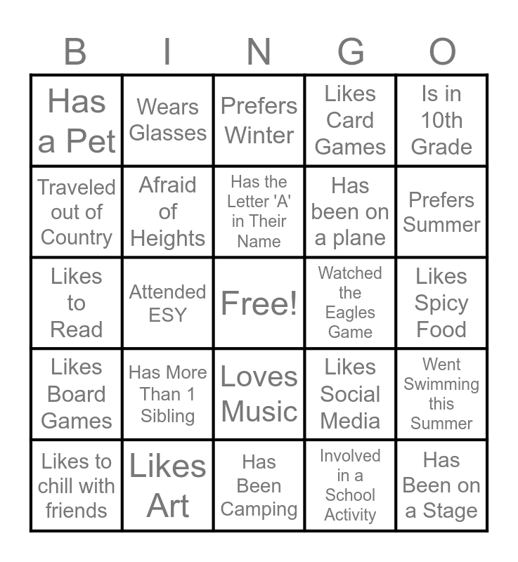 This bingo card has a free space and 24 words: Has More Than 1 Sibling, Likes Art, Has the Letter 'A' in Their Name, Likes to chill with friends, Is in 10th Grade, Has a Pet, Traveled out of Country, Wears Glasses, Watched the Eagles Game, Loves Music, Has been on a plane, Likes to Read, Likes Social Media, Went Swimming this Summer, Afraid of Heights, Involved in a School Activity, Likes Spicy Food, Prefers Winter, Prefers Summer, Attended ESY, Has Been on a Stage, Likes Board Games, Likes Card Games and Has Been Camping.