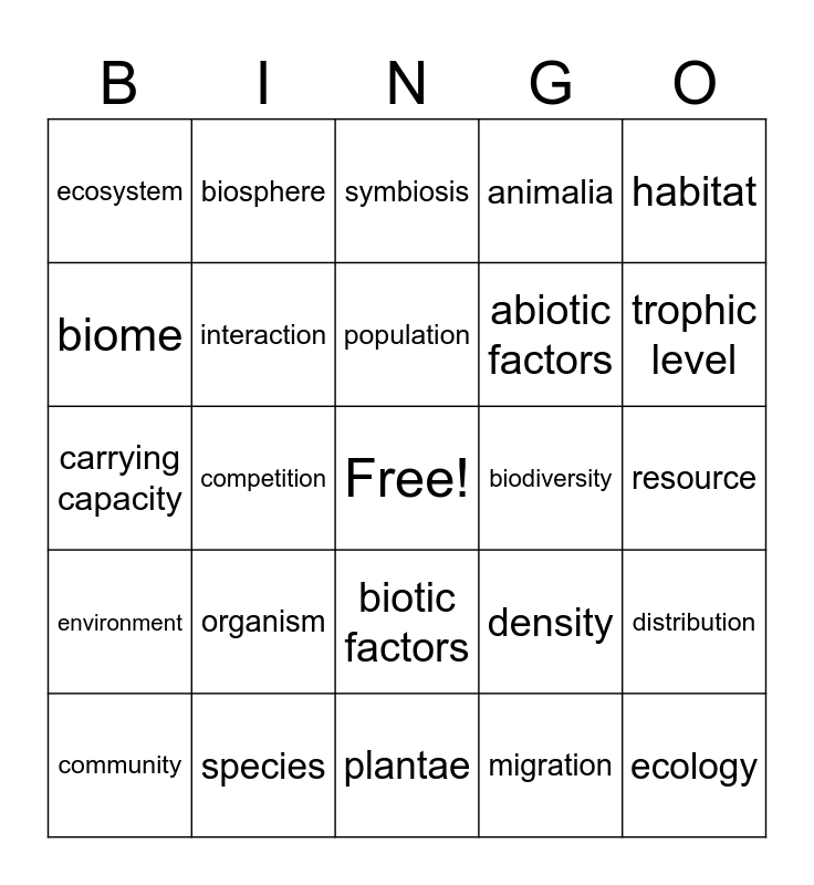 This bingo card has a free space and 24 words: organism, species, population, community, habitat, ecosystem, biome, biosphere, biodiversity, biotic factors, abiotic factors, carrying capacity, density, distribution, interaction, migration, resource, symbiosis, trophic level, competition, ecology, environment, animalia and plantae.