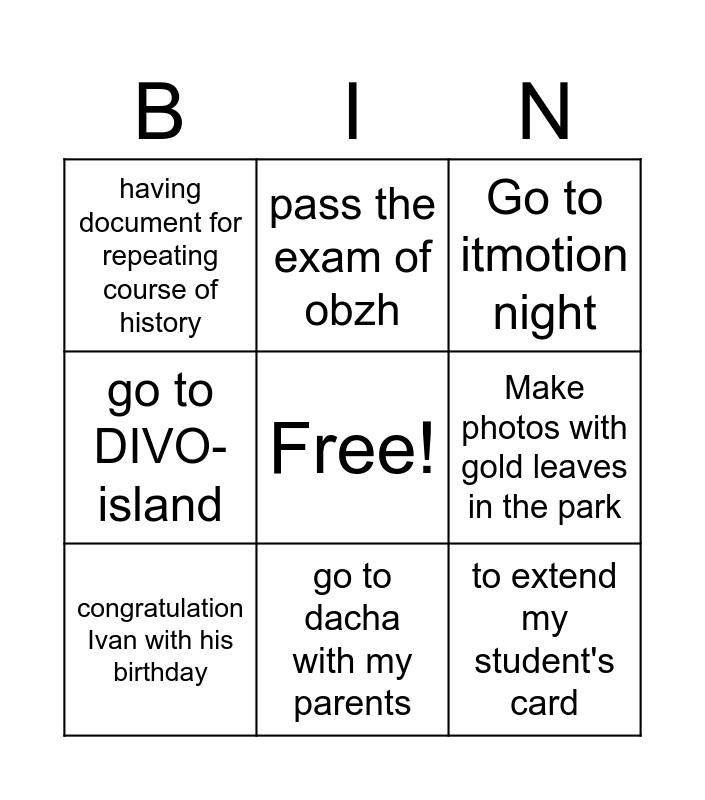 This bingo card has a free space and 8 words: Make photos with gold leaves in the park, Go to itmotion night, pass the exam of obzh, congratulation Ivan with his birthday, having document for repeating course of history, to extend my student's card, go to DIVO-island and go to dacha with my parents.