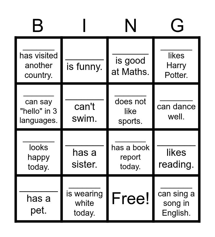 This bingo card has 17 words: Free!, _______ has a pet., _______ is good at Maths., _______ has visited another country., _______ has a sister., _______ likes Harry Potter., _______ likes reading., _______ does not like sports., _______ can dance well., _______ can't swim., _______ is wearing white today., _______ has a book report today., _______ can say "hello" in 3 languages., _______ is funny., _______ looks happy today., _______ is good at basketball. and _______ can sing a song in English..