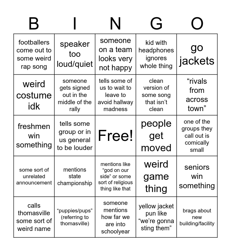 This bingo card has a free space and 27 words: weird game thing, someone falls down, clean version of some song that isn’t clean, someone mentions how far we are into schoolyear, weird costume idk, someone on a team looks very not happy, speaker too loud/quiet, some sort of unrelated announcement, people get moved, seniors win something, freshmen win something, kid with headphones ignores whole thing, calls thomasville some sort of weird name, “puppies/pups” (referring to thomasville), “rivals from across town”, mentions us being top of our division, someone gets signed out in the middle of the rally, tells some of us to wait to leave to avoid hallway madness, mentions state championship, footballers come out to some weird rap song, one of the groups they call out is comically small, yellow jacket pun like “we’re gonna sting them”, tells some group or in us general to be louder, brags about new building/facility, mentions like “god on our side” or some sort of religious thing like that, go jackets and band stands there awkwardly.