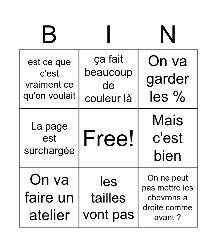 This bingo card has a free space and 9 words: On va faire un atelier, On va garder les %, ça fait beaucoup de couleur là, La page est surchargée, est ce que c'est vraiment ce qu'on voulait, Mais c'est bien, On ne peut pas mettre les chevrons a droite comme avant ?, Il faudrait deplier les themes tout le temps and les tailles vont pas.