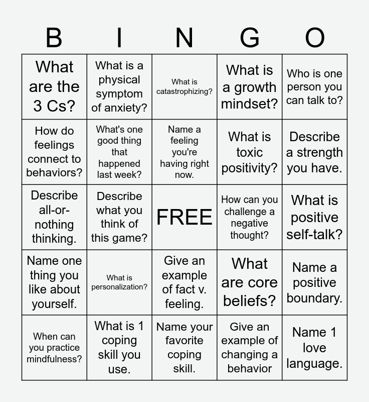 This bingo card has a free space and 34 words: How do thoughts connect to feelings?, Give an example of changing a behavior, Describe labeling., What is a thought record?, Name one thing you like about yourself., What's one good thing that happened last week?, Who is one person you can talk to?, When can you practice mindfulness?, What is a physical symptom of anxiety?, What is disqualifying the positive?, Name a feeling you're having right now., What is catastrophizing?, What skill can you use when you're angry?, What does CBT stand for?, How can you challenge a negative thought?, Describe a strength you have., What is 1 coping skill you use., Describe all-or-nothing thinking., What is personalization?, What are core beliefs?, Give an example of fact v. feeling., Name 5 things you see., What are the 3 Cs?, What is positive self-talk?, Name your favorite coping skill., Name 1 love language., What is a growth mindset?, What is a fixed mindset?, What is toxic positivity?, How do feelings connect to behaviors?, Name 5 people in this room., Describe what you think of this game?, Name a positive boundary. and Name 1 goal you have..