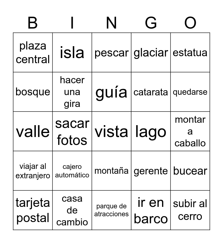 This bingo card has a free space and 24 words: cajero automático, casa de cambio, guía, tarjeta postal, estatua, plaza central, bosque, isla, lago, montaña, catarata, valle, gerente, bucear, hacer una gira, ir en barco, montar a caballo, pescar, quedarse, sacar fotos, subir al cerro, viajar al extranjero, glaciar and parque de atracciones.