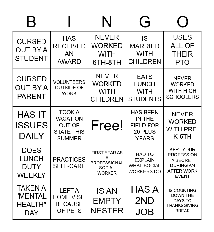 This bingo card has a free space and 24 words: PRACTICES SELF-CARE, LEFT A HOME VISIT BECAUSE OF PETS, NEVER WORKED WITH CHILDREN, TAKEN A "MENTAL HEALTH" DAY, USES ALL OF THEIR PTO, CURSED OUT BY A STUDENT, CURSED OUT BY A PARENT, HAS RECEIVED AN AWARD, HAS BEEN IN THE FIELD FOR 20 PLUS YEARS, FIRST YEAR AS A PROFESSIONAL SOCIAL WORKER, EATS LUNCH WITH STUDENTS, HAS IT ISSUES DAILY, HAD TO EXPLAIN WHAT SOCIAL WORKERS DO, KEPT YOUR PROFESSION A SECRET DURING AN AFTER WORK EVENT, VOLUNTEERS OUTSIDE OF WORK, HAS A 2ND JOB, NEVER WORKED WITH PRE-K-5TH, NEVER WORKED WITH 6TH-8TH, NEVER WORKED WITH HIGH SCHOOLERS, TOOK A VACATION OUT OF STATE THIS SUMMER, IS COUNTING DOWN THE DAYS TO THANKSGIVING BREAK, DOES LUNCH DUTY WEEKLY, IS MARRIED WITH CHILDREN and IS AN EMPTY NESTER.