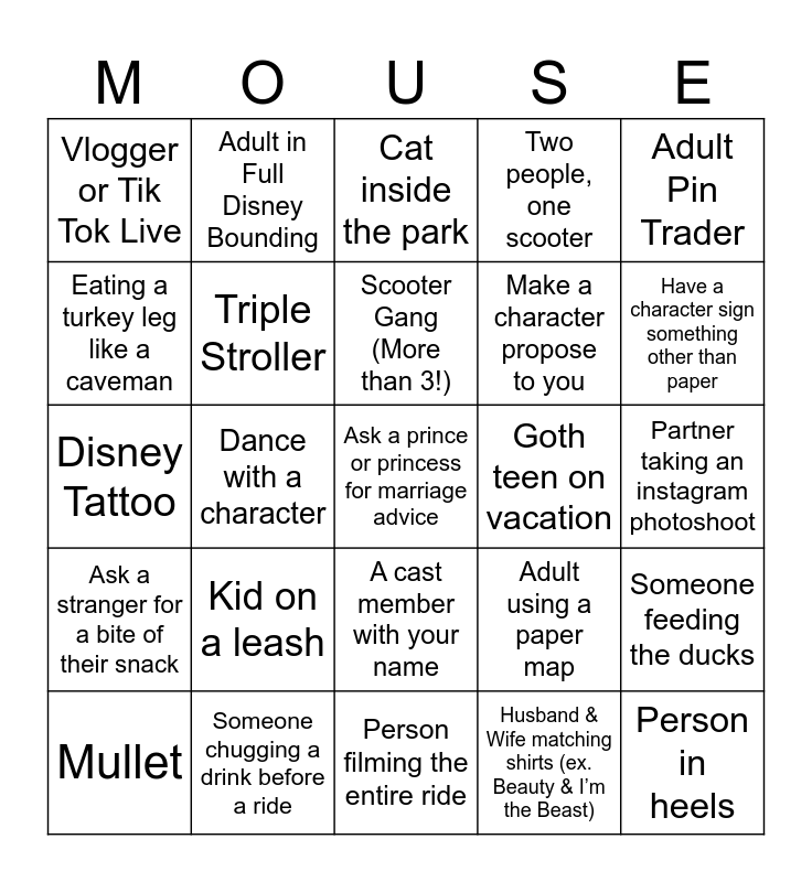 This bingo card has a free space and 24 words: Mullet, Kid on a leash, Scooter Gang (More than 3!), Husband & Wife matching shirts (ex. Beauty & I’m the Beast), Adult Pin Trader, Vlogger or Tik Tok Live, Adult in Full Disney Bounding, Cat inside the park, Goth teen on vacation, Partner taking an instagram photoshoot, Disney Tattoo, Triple Stroller, Adult using a paper map, Someone feeding the ducks, Eating a turkey leg like a caveman, Someone chugging a drink before a ride, Person filming the entire ride, Two people, one scooter, Have a character sign something other than paper, Ask a stranger for a bite of their snack, Dance with a character, A cast member with your name, Make a character propose to you and Person in heels.