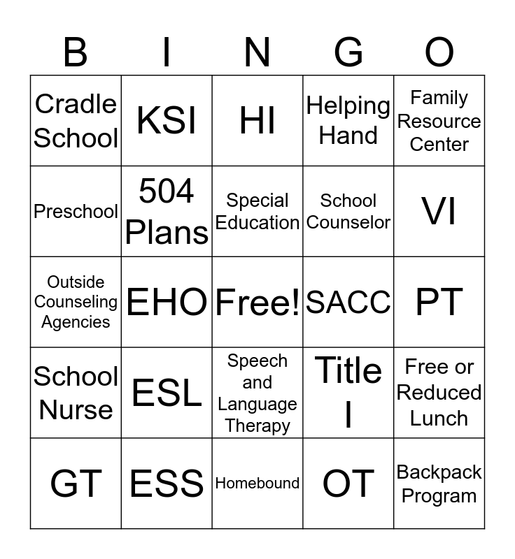 This bingo card has a free space and 24 words: ESL, ESS, Special Education, GT, Family Resource Center, Cradle School, Preschool, KSI, SACC, Speech and Language Therapy, School Counselor, Outside Counseling Agencies, Title I, Free or Reduced Lunch, 504 Plans, OT, PT, HI, VI, EHO, Backpack Program, School Nurse, Helping Hand and Homebound.