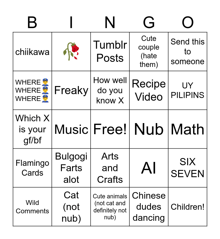 This bingo card has a free space and 24 words: Bulgogi Farts alot, Cat (not nub), How well do you know X, Wild Comments, Send this to someone, chiikawa, WHERE👮♂️ WHERE👮♂️ WHERE👮♂️, 🥀, Nub, Arts and Crafts, Recipe Video, Which X is your gf/bf, AI, SIX SEVEN, Freaky, Chinese dudes dancing, Math, Tumblr Posts, UY PILIPINS, Music, Children!, Flamingo Cards, Cute couple (hate them) and Cute animals (not cat and definitely not nub).