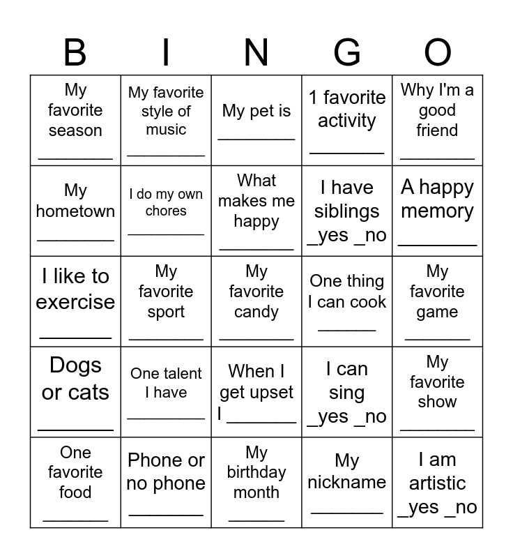 This bingo card has 25 words: One talent I have _________, My birthday month ______, What makes me happy ________, One favorite food _______, Why I'm a good friend ________, My favorite season ________, My hometown ________, My favorite style of music _________, One thing I can cook ______, When I get upset I _______, I have siblings _yes _no, I like to exercise ______, I can sing _yes _no, My favorite show ________, I do my own chores __________, I am artistic _yes _no, My favorite game _______, My pet is ________, A happy memory _______, My favorite sport ________, My favorite candy ________, Phone or no phone _______, Dogs or cats ______, 1 favorite activity _______ and My nickname _______.