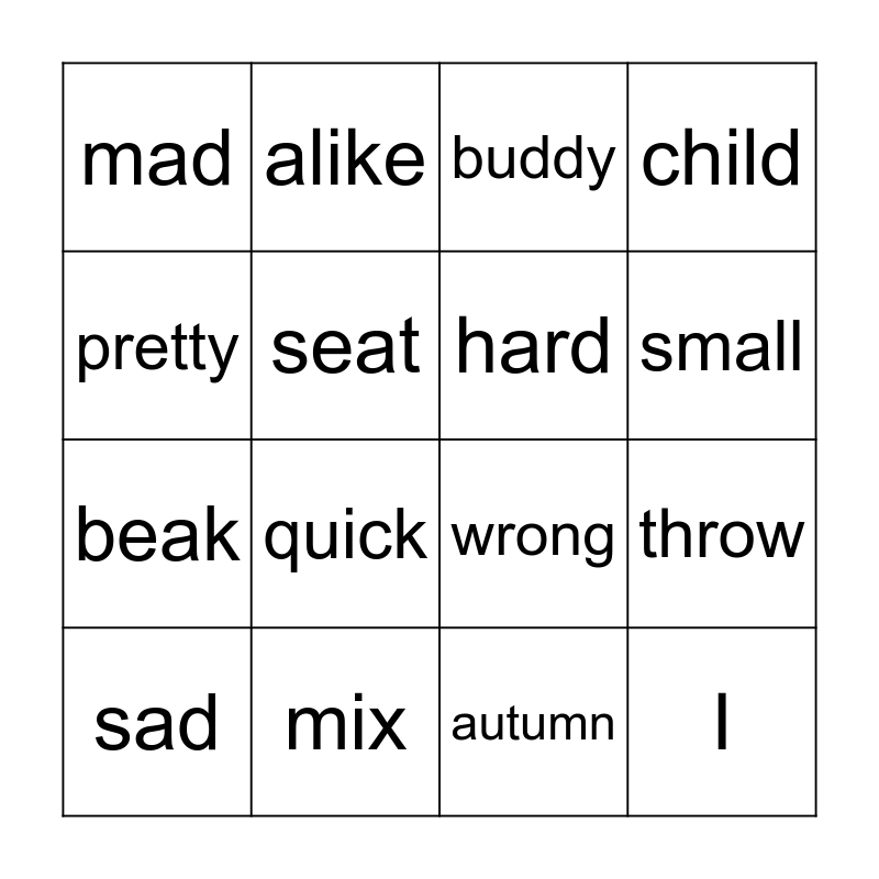 This bingo card has 30 words: many, glad, throw, author, mad, buddy, hard, below, mix, big, autumn, sad, sea, start, quick, bunch, rabbit, I, look, pretty, wrong, shove, alike, beak, seat, child, cab, ship, small and pick.