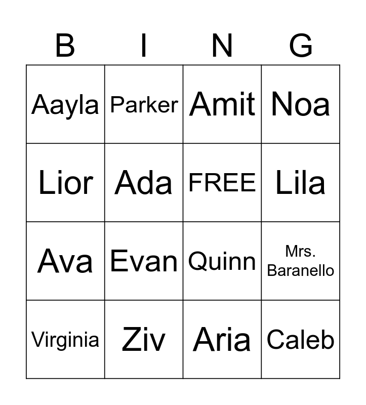 This bingo card has 16 words: Ziv, Mrs. Baranello, Amit, Aayla, Ava, Parker, Quinn, Aria, Lior, Ada, Virginia, Noa, Evan, Lila, FREE and Caleb.