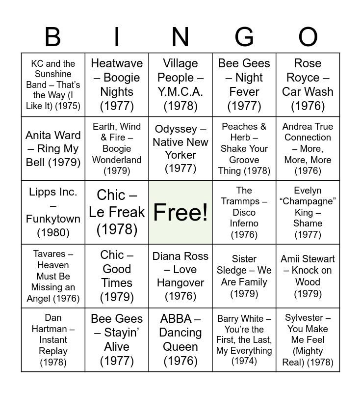 This bingo card has a free space and 30 words: Bee Gees – Stayin’ Alive (1977), Donna Summer – I Feel Love (1977), Chic – Le Freak (1978), Gloria Gaynor – I Will Survive (1978), KC and the Sunshine Band – That’s the Way (I Like It) (1975), Village People – Y.M.C.A. (1978), Earth, Wind & Fire – Boogie Wonderland (1979), Diana Ross – Love Hangover (1976), The Trammps – Disco Inferno (1976), ABBA – Dancing Queen (1976), Evelyn “Champagne” King – Shame (1977), Sylvester – You Make Me Feel (Mighty Real) (1978), Barry White – You’re the First, the Last, My Everything (1974), Thelma Houston – Don’t Leave Me This Way (1976), Andrea True Connection – More, More, More (1976), Patrick Hernandez – Born to Be Alive (1978), Sister Sledge – We Are Family (1979), Tavares – Heaven Must Be Missing an Angel (1976), Chic – Good Times (1979), Rose Royce – Car Wash (1976), Lipps Inc. – Funkytown (1980), Michael Jackson – Don’t Stop ’Til You Get Enough (1979), Heatwave – Boogie Nights (1977), Peaches & Herb – Shake Your Groove Thing (1978), Anita Ward – Ring My Bell (1979), Bee Gees – Night Fever (1977), Amii Stewart – Knock on Wood (1979), Dan Hartman – Instant Replay (1978), Odyssey – Native New Yorker (1977) and Chic – Everybody Dance (1977).