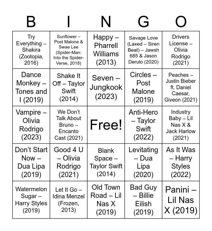 This bingo card has a free space and 30 words: Let It Go – Idina Menzel (Frozen, 2013), Into the Unknown – Idina Menzel & AURORA (Frozen II, 2019), We Don’t Talk About Bruno – Encanto Cast (2021), Surface Pressure – Jessica Darrow (Encanto, 2021), Try Everything – Shakira (Zootopia, 2016), Happy – Pharrell Williams (2013), Shake It Off – Taylor Swift (2014), Blank Space – Taylor Swift (2014), Anti-Hero – Taylor Swift (2022), Old Town Road – Lil Nas X (2019), Industry Baby – Lil Nas X & Jack Harlow (2021), Panini – Lil Nas X (2019), Bad Guy – Billie Eilish (2019), Therefore I Am – Billie Eilish (2020), Peaches – Justin Bieber ft. Daniel Caesar, Giveon (2021), Stay – The Kid LAROI & Justin Bieber (2021), Levitating – Dua Lipa (2020), Don’t Start Now – Dua Lipa (2019), Good 4 U – Olivia Rodrigo (2021), Drivers License – Olivia Rodrigo (2021), Vampire – Olivia Rodrigo (2023), Happier – Marshmello & Bastille (2018), Sunflower – Post Malone & Swae Lee (Spider-Man: Into the Spider-Verse, 2018), Circles – Post Malone (2019), Dance Monkey – Tones and I (2019), Savage Love (Laxed – Siren Beat) – Jawsh 685 & Jason Derulo (2020), As It Was – Harry Styles (2022), Watermelon Sugar – Harry Styles (2019), Seven – Jungkook (2023) and Baby Shark Dance – Pinkfong (2016).