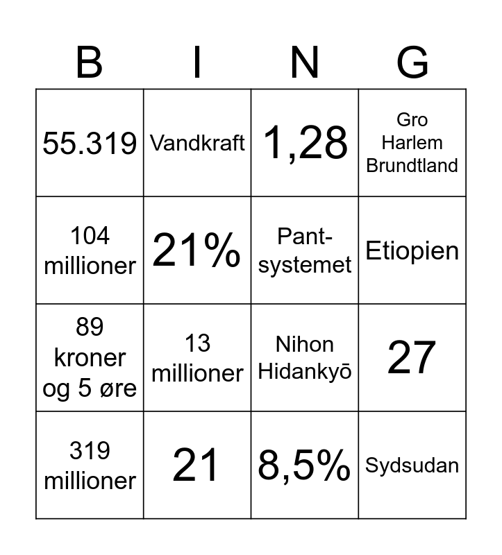 This bingo card has 48 words: Kina, 319 millioner, Trafik, 754 millioner, Skotland, 0,76%, Vandkraft, 6,6 millioner, 21%, 1248, Pant-systemet, Gro Harlem Brundtland, 25%, 69%, Finland, 4, Etiopien, 21, 5 millioner, 104 millioner, 27, 67%, 55.319, 89 kroner og 5 øre, 2021, 13 millioner, Nokia, 25, 344, Sydsudan, Malala Yousafzai, Gravide kvinder, Niger, Mænd, Rwanda, 54, 60, 8,5%, Slovenien, 64, 70%, Reduce, Reuse, Recycle, 1,28, The Great Pacific Garbage Patch, Nihon Hidankyō, Conference of Parties, Akvakultur and DR Congo.