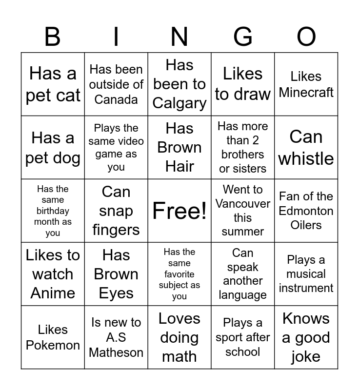 This bingo card has a free space and 24 words: Has Brown Eyes, Is new to A.S Matheson, Has Brown Hair, Likes Pokemon, Likes Minecraft, Has a pet cat, Has a pet dog, Has been outside of Canada, Went to Vancouver this summer, Has the same favorite subject as you, Has more than 2 brothers or sisters, Has the same birthday month as you, Can speak another language, Plays a musical instrument, Plays the same video game as you, Plays a sport after school, Fan of the Edmonton Oilers, Has been to Calgary, Can whistle, Can snap fingers, Knows a good joke, Likes to watch Anime, Likes to draw and Loves doing math.