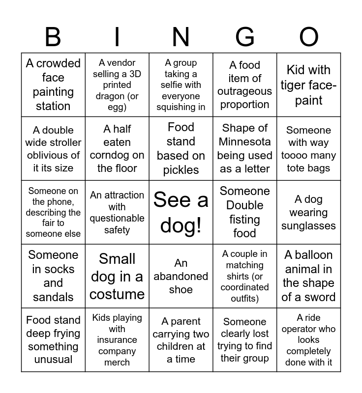 This bingo card has a free space and 24 words: Small dog in a costume, Kids playing with insurance company merch, Food stand based on pickles, Food stand deep frying something unusual, Kid with tiger face-paint, A crowded face painting station, A double wide stroller oblivious of it its size, A vendor selling a 3D printed dragon (or egg), Someone Double fisting food, An abandoned shoe, Shape of Minnesota being used as a letter, Someone on the phone, describing the fair to someone else, A couple in matching shirts (or coordinated outfits), A balloon animal in the shape of a sword, A half eaten corndog on the floor, Someone clearly lost trying to find their group, A dog wearing sunglasses, A group taking a selfie with everyone squishing in, Someone with way toooo many tote bags, An attraction with questionable safety, A ride operator who looks completely done with it, Someone in socks and sandals, A food item of outrageous proportion and A parent carrying two children at a time.