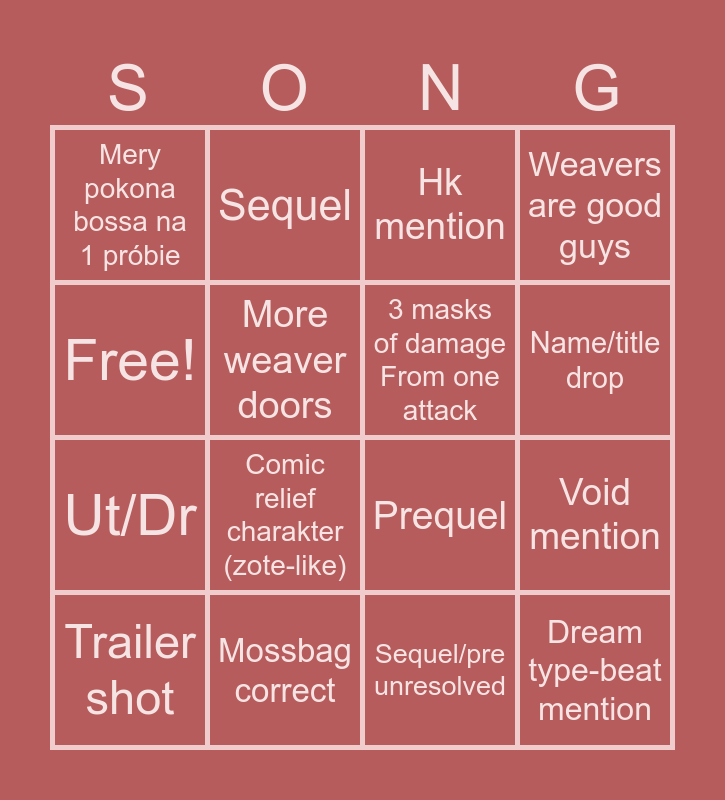 This bingo card has 16 words: Mossbag correct, Void mention, Hk mention, Mery pokona bossa na 1 próbie, Ut/Dr, Sequel, Prequel, Sequel/pre unresolved, Free!, More weaver doors, Trailer shot, Weavers are good guys, Comic relief charakter (zote-like), Name/title drop, 3 masks of damage From one attack and Dream type-beat mention.