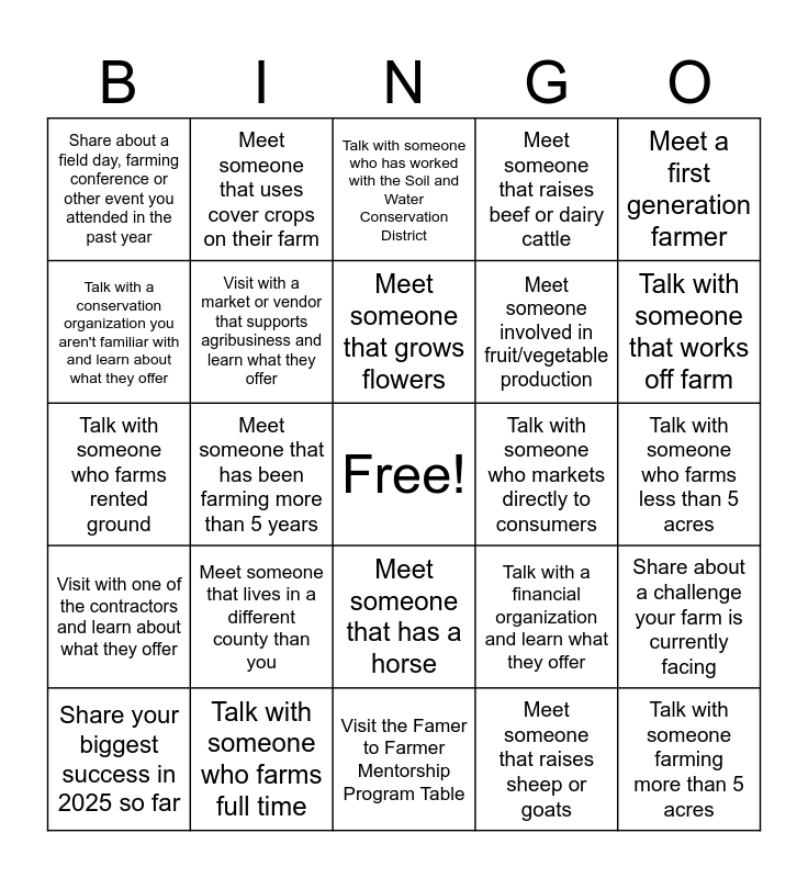 This bingo card has a free space and 24 words: Meet someone that lives in a different county than you, Talk with someone who farms full time, Meet someone that grows flowers, Share your biggest success in 2025 so far, Meet a first generation farmer, Share about a field day, farming conference or other event you attended in the past year, Talk with a conservation organization you aren't familiar with and learn about what they offer, Meet someone that uses cover crops on their farm, Talk with someone who markets directly to consumers, Meet someone that has a horse, Meet someone involved in fruit/vegetable production, Talk with someone who farms rented ground, Talk with a financial organization and learn what they offer, Share about a challenge your farm is currently facing, Visit with a market or vendor that supports agribusiness and learn what they offer, Meet someone that raises sheep or goats, Talk with someone who farms less than 5 acres, Talk with someone who has worked with the Soil and Water Conservation District, Talk with someone that works off farm, Meet someone that has been farming more than 5 years, Talk with someone farming more than 5 acres, Visit with one of the contractors and learn about what they offer, Meet someone that raises beef or dairy cattle and Visit the Famer to Farmer Mentorship Program Table.