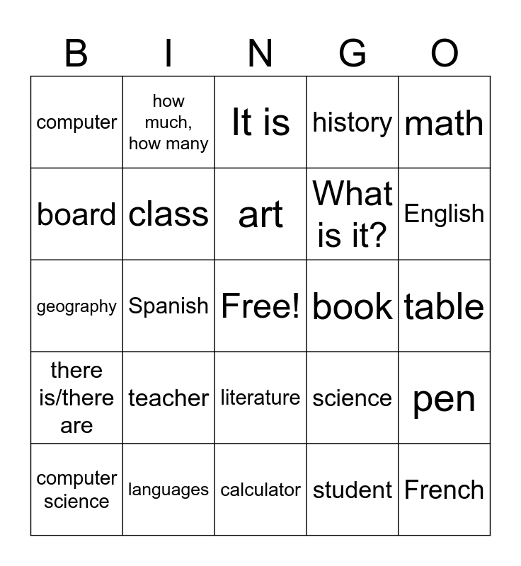 This bingo card has a free space and 27 words: science, to study, What is it?, calculator, board, It is, how much, how many, there is/there are, book, pen, geography, history, computer science, languages, English, school subjects, class, art, teacher, computer, table, student, Spanish, French, literature, math and music.
