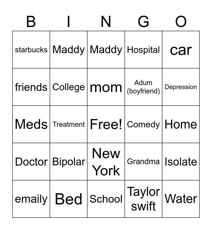 This bingo card has a free space and 25 words: Bipolar, School, mom, emaily, car, starbucks, friends, Maddy, Comedy, New York, Adum (boyfriend), Meds, Grandma, Isolate, College, Free space, Home, Maddy, Depression, Treatment, Water, Bed, Doctor, Hospital and Taylor swift.