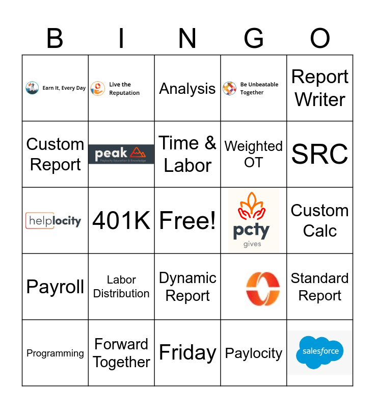 This bingo card has 8 images, a free space and 19 words: HR & Payroll, Weighted OT, Friday, Custom Report, Analysis, Payroll, Standard Report, Programming, Forward Together, SRC, Timecard, Time & Labor, Labor Distribution, Custom Calc, Paylocity, 401K, Dynamic Report, Report Writer and National Payroll Week.