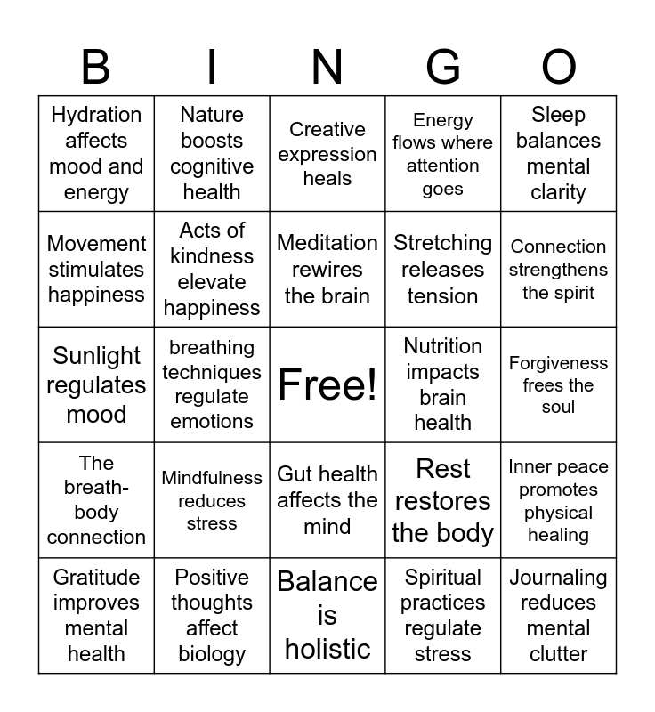 This bingo card has a free space and 24 words: Mindfulness reduces stress, Positive thoughts affect biology, Meditation rewires the brain, Gratitude improves mental health, Sleep balances mental clarity, Hydration affects mood and energy, Movement stimulates happiness, Nature boosts cognitive health, Nutrition impacts brain health, Gut health affects the mind, Stretching releases tension, Sunlight regulates mood, Rest restores the body, Inner peace promotes physical healing, Acts of kindness elevate happiness, Spiritual practices regulate stress, Forgiveness frees the soul, Creative expression heals, Connection strengthens the spirit, breathing techniques regulate emotions, Journaling reduces mental clutter, The breath-body connection, Energy flows where attention goes and Balance is holistic.
