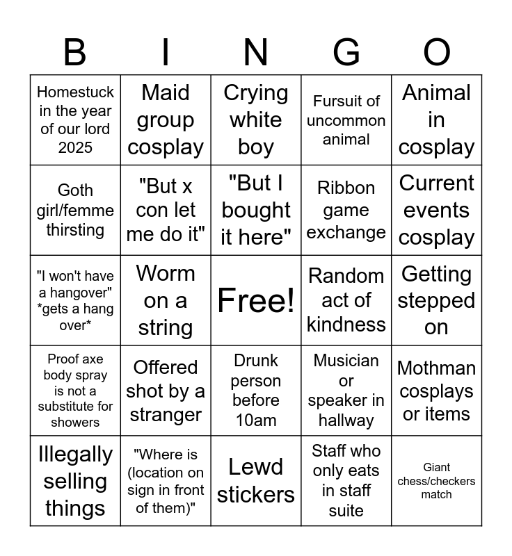 This bingo card has a free space and 33 words: Crying white girl, Ribbon cape or skirt, Worm on a string, Jesus cosplayer, Proof axe body spray is not a substitute for showers, "But x con let me do it", Animal in cosplay, Illegally selling things, Maid group cosplay, Obscure cosplay, "But I bought it here", Crying white boy, Free space, Missing mihoyo cosplay pieces, Random act of kindness, Current events cosplay, "Where is (location on sign in front of them)", "I won't have a hangover" *gets a hang over*, Offered shot by a stranger, Musician or speaker in hallway, Drunk person before 10am, Muscle mommy thirsting, Homestuck in the year of our lord 2025, Getting stepped on, Lewd stickers, Giant chess/checkers match, Fursuit of uncommon animal, Ribbon game exchange, Goth girl/femme thirsting, Mothman cosplays or items, Random act of kindness, Staff who only eats in staff suite and Staff who never eats in staff suite.