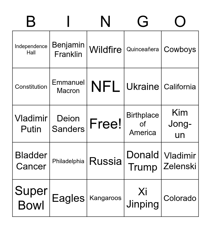 This bingo card has a free space and 24 words: Philadelphia, Eagles, NFL, Super Bowl, Cowboys, Independence Hall, Constitution, Benjamin Franklin, Birthplace of America, Russia, Ukraine, Vladimir Putin, Donald Trump, Vladimir Zelenski, Emmanuel Macron, Xi Jinping, Kim Jong-un, Wildfire, California, Deion Sanders, Colorado, Bladder Cancer, Quinceañera and Kangaroos.